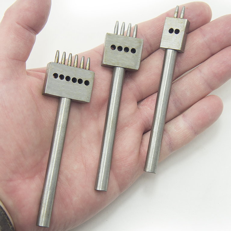 A set of three professional-grade steel hole punches for leather crafting A set of three punches, with 2, 4 and 6 prongs with 4mm spacing between spongs. Suitable for hole-punching in all grades of leather Size: 10.5 cm x 8mm. Punch hole diameter: 1mm. Material: steel. Prongs are sharp, hard-wearing and durable, the three sets of prongs are versatile and allow precise placing of holes.