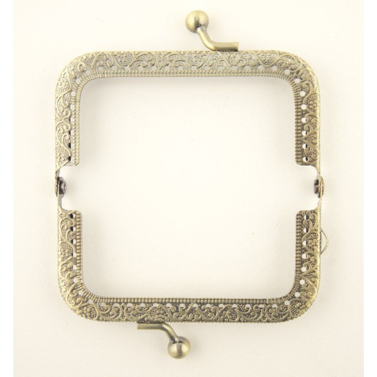 Squared metal purse frame with decorative flower engravings and perforations, and ball kiss-claps lock handles. Attractive antique brass colour. Size: 8 x 4 cm. Ideal for designing, making and altering purses and handbags. Give your purse project that extra-stylish antique touch