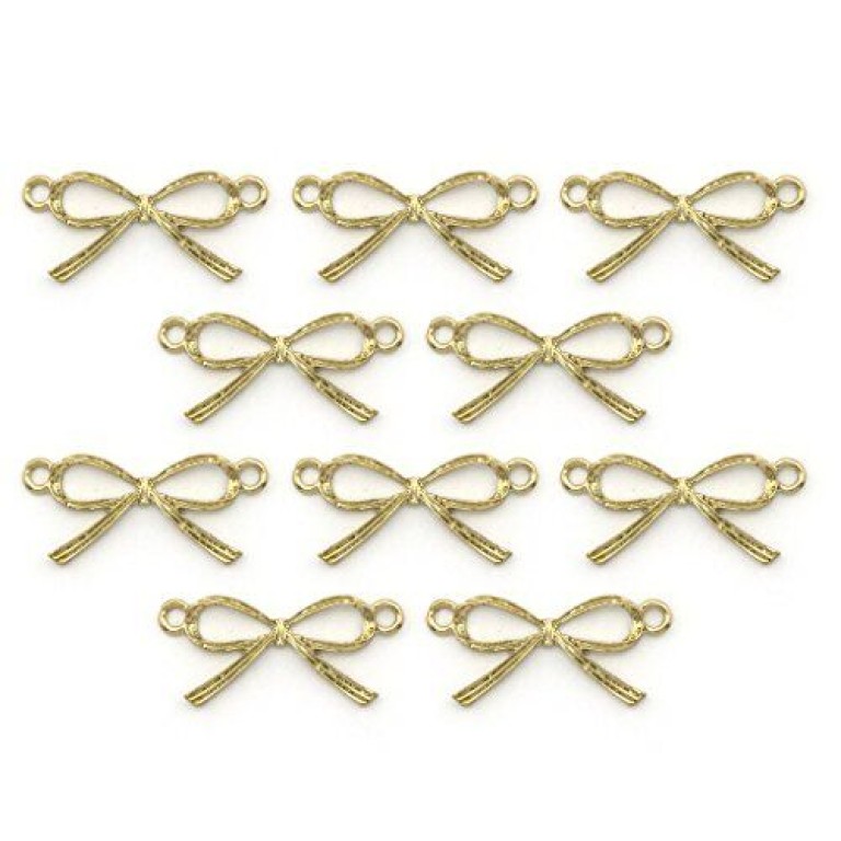 Gold colour ribbon bow pendants - for necklaces, jewelry, clothing, bags and accessories. Pack of 10. Size: 29mm x 14mm. Colour: gold. Perfect for adding a touch of style to jewellery, dresses, skirts, blouses, bags, accessories etc.