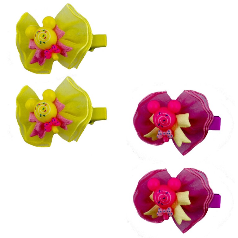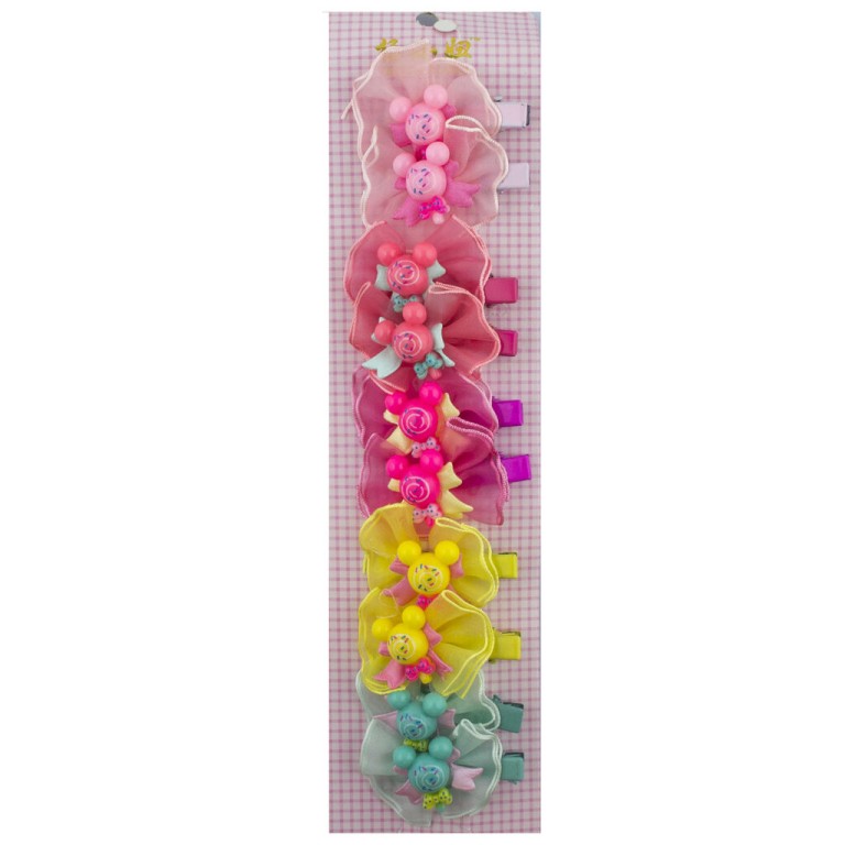 - A pack of 2 pairs of small cartoon girl organza rosette, ribbon bow and bead alligator hair clips.