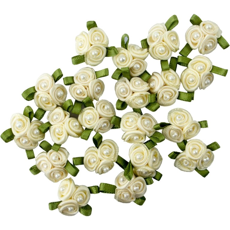 - A pack of roses ribbon flower trims in three bloom clusters with pearl effect flower centres.