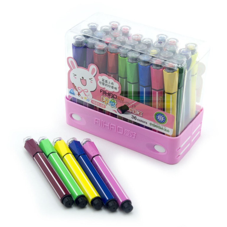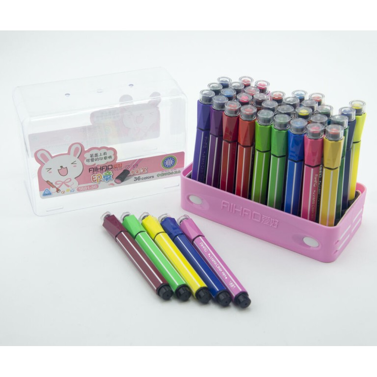 - A set of 36 2 in 1 colourful felt tip marker pens made with washable inks comes with 36 different stamps on the tip.