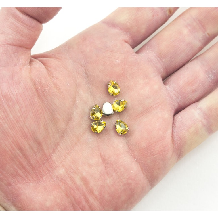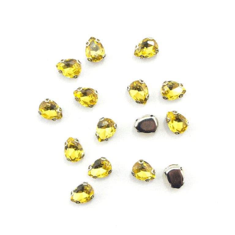 A set of teardrop shaped glass crystal sew in trims for dresses, outfits, accessories etc. Pack of 15 Size: 8 x 6 mm Colour: golden yellow. Material : glass, metal. Ideal for fashion, jewellery designers, haberdashery, students and home garment crafters