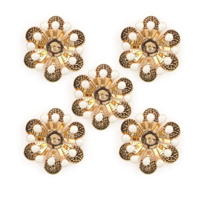 Brass and white enamel flower sew-on trims. Pack of 5. Size: 28mm x 28mm. Colour: gold and white. Perfect for adding a touch of style and colour to dresses, skirts, blouses, accessories etc.