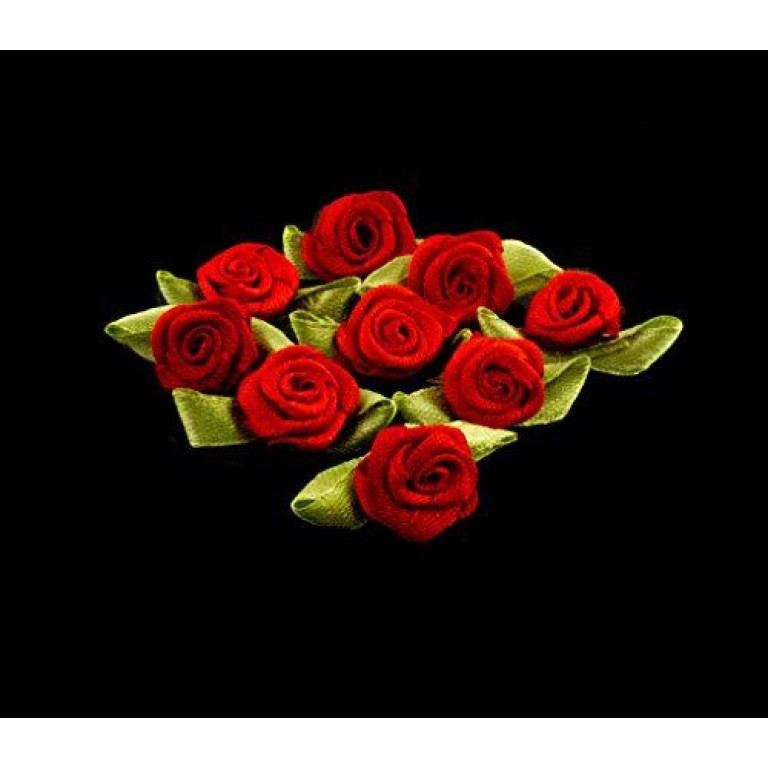 Red fabric sew in flower trims, accessories, decorations. Pack of 50. Size: 25 mm x 15 mm. Colour: red and green. Material: ribbon. Perfect for adding a touch of colour and style to jewellery, dresses, skirts, blouses, bags, accessories etc.