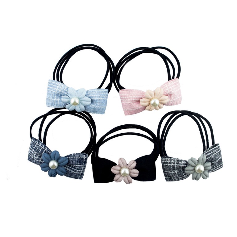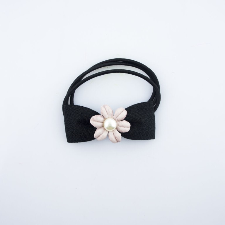 - A set of stylish black elasticated hair bands with large check fabric bows and pretty flowers with pearl effect beads.