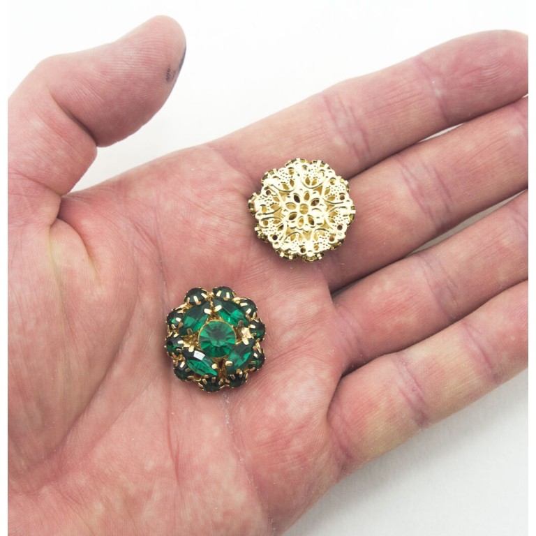 A set of dark emerald green encrusted sew in garment embellishments in a gold tone setting Set of 3 Material: Glass, metal. Size: 24 mm diameter Colour: emerald green crystals in a gold tone setting Ideal for fashion professionals, students and home dress makers