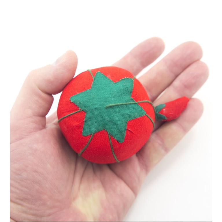 A pair of large tomato style fabric pin cushions Size: 70 mm diameter Sewing needles and pins stay safe and organised Handy size for sewing basket or your little tool bag Use emery to sharpen and clean pins