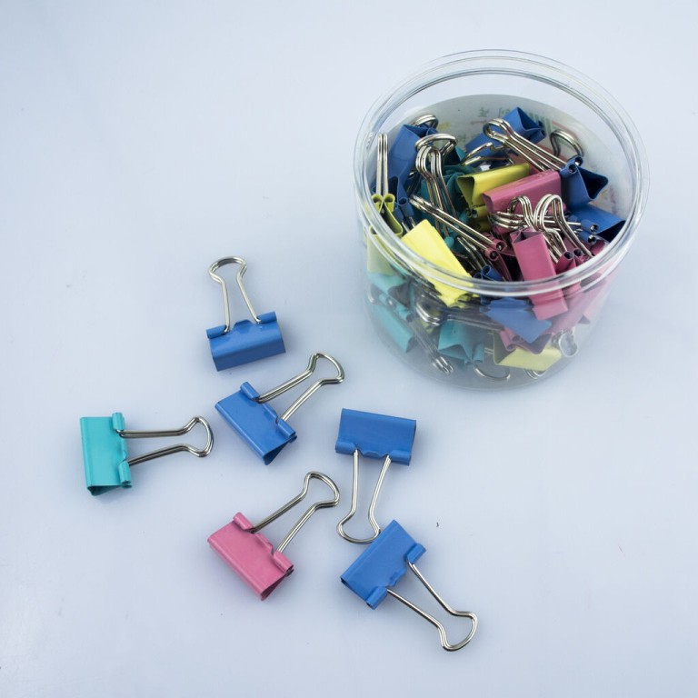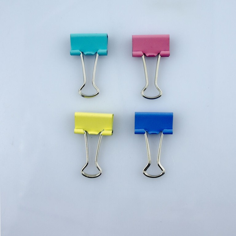 - A pack of colourful metal foldback bull clips for home, school and office.