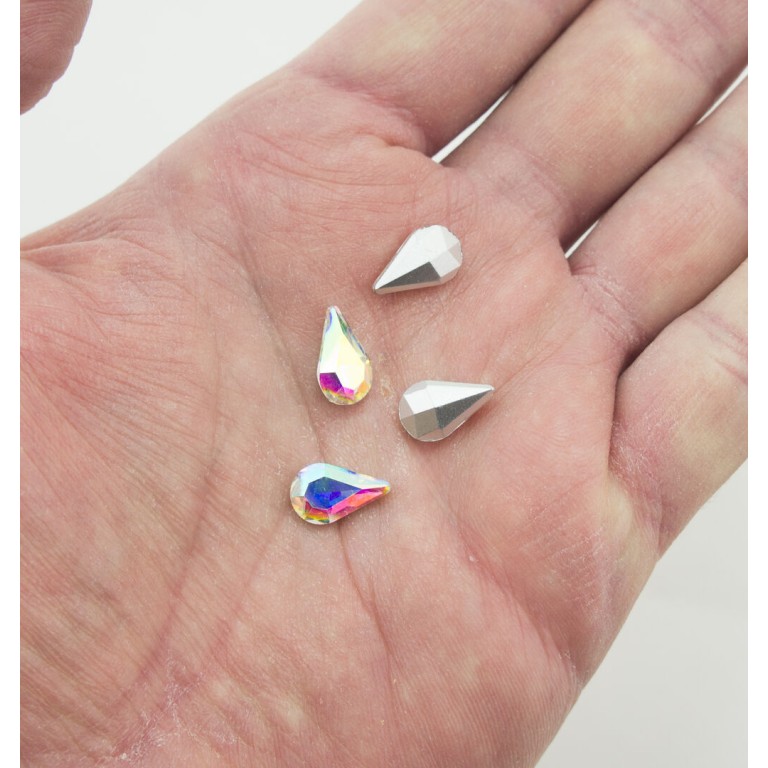 A set of teardrop shaped crystal glass sew in embellishment trims in metal tone settings Pack of 50 Size: 8 x 13 mm Material: cystal glass. Colour: iridescent AB Ideal for fashion professionals, students and home dress makers