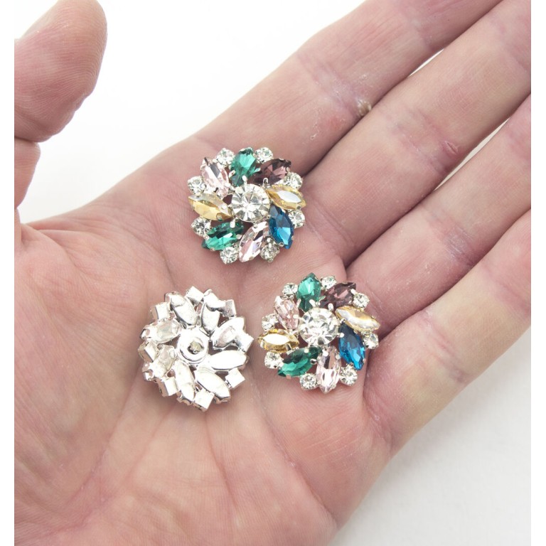 A set of 3 large diamante crystal encrusted buttons With green, blue, rose pink, gold, brown and clear crystals in a silver tone setting. Pack of 3. Size: 28 mm diameter Great for evening wear and vintage cardigan, also as a decroation on the scarf and gloves etc. Perfect for fashion, jewellery designers, students and home crafters.