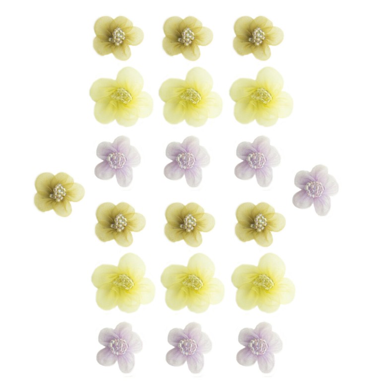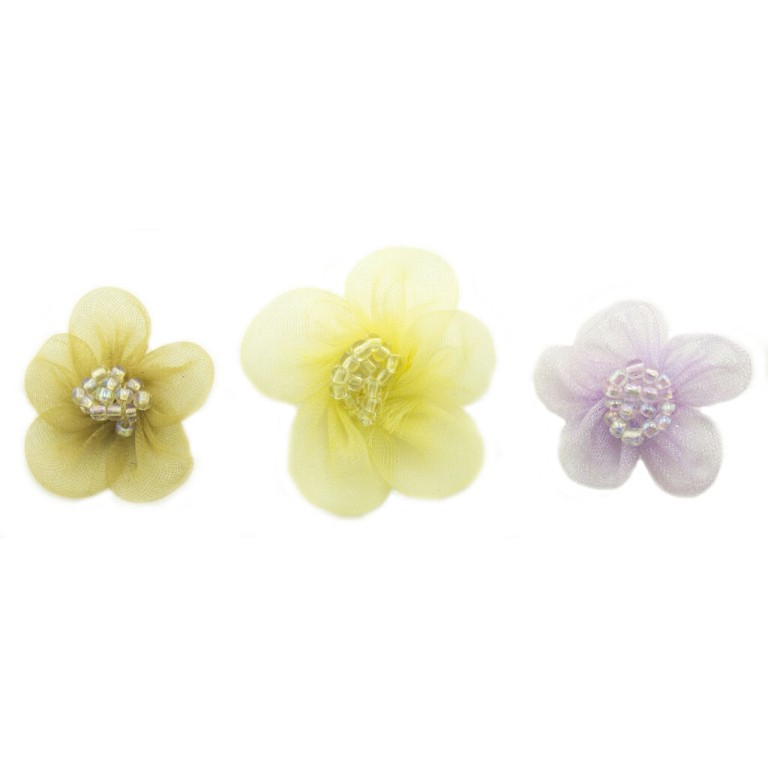- A pack of pretty organza flower sew on trims with central bead clusters for garment, accessory and soft furnishing embellishment.