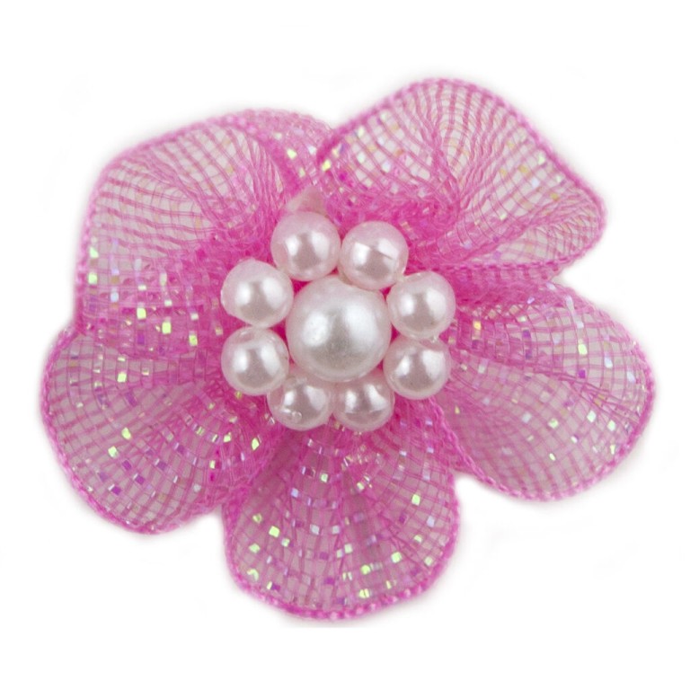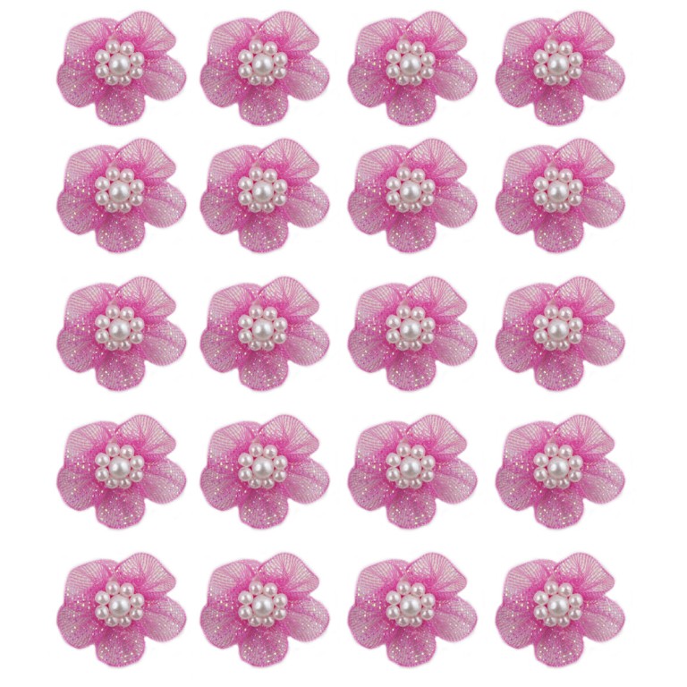 - A pack of pretty shiny mesh flower trims with central bead clusters.