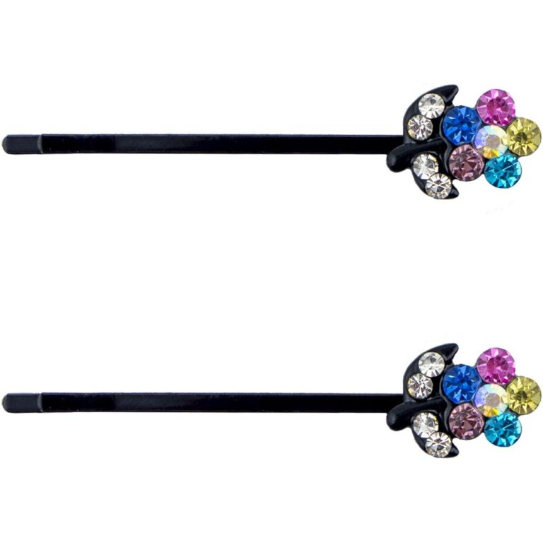 • A pack of 2 pairs elegant hair clips with coloured blooming flower crystal motifs.