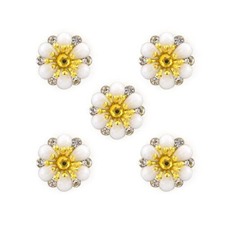 White enamel, brass and diamante flower sew-on trims - embellishments for clothing, accessories etc. Pack of 5. Size: 18mm x 18mm. Colour: white. Perfect for adding a touch of style and colour to dresses, skirts, blouses, accessories etc.