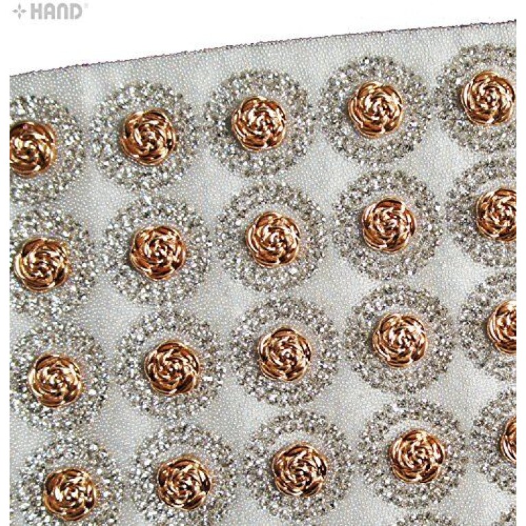 - 160 gold roses with rhinstones and tiny balls around on continuous Iron-on sheet (can be cut to any size).