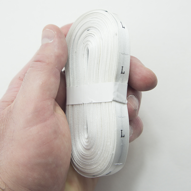 • A roll of 500 white silk size labels - LARGE (L).