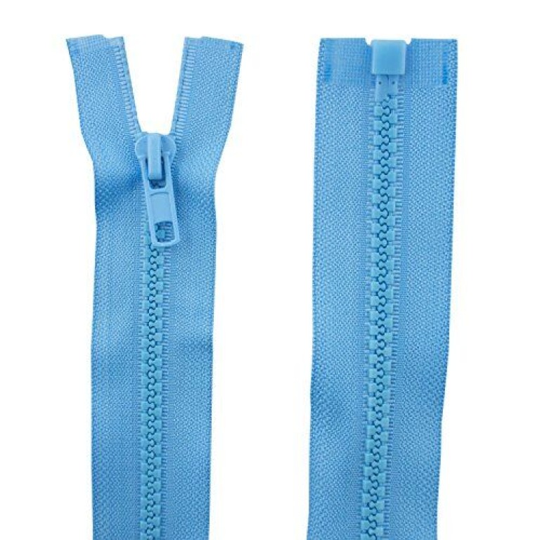 A pair of attractively coloured automatic plastic open-end zips mounted on a strong fabric base. Size: 65 cm long x 32 mm wide. Colour: sky blue. Great for professional, student and home fashion projects and garment repair, adjustment and customisation. Material: plastic and fabric.